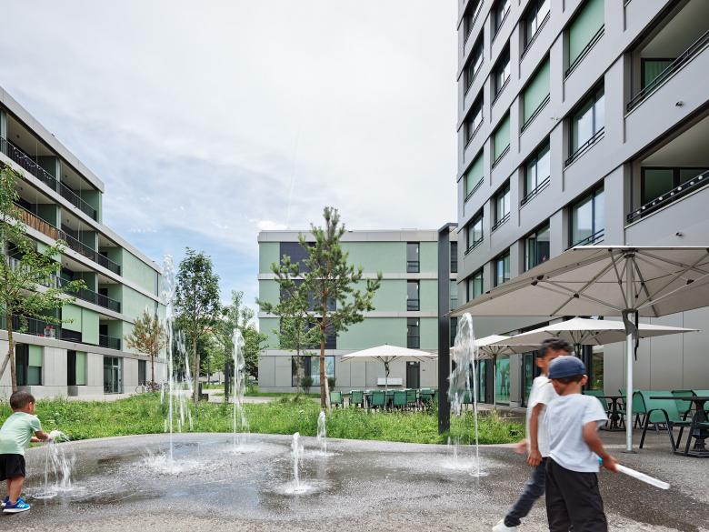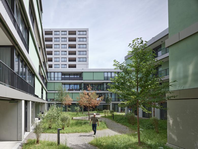 Für die vier- bis sechsgeschossigen Wohnbauten wird die Typologie der offenen Höfe gewählt. Zwei Hofbebauungen sind derart gesetzt und gestaffelt, dass sie unabhängig von der Dreiecksgeometrie des Areals eine homogene Bebauung formen. Die Höhenentwicklung akzentuiert dabei die westliche und südliche Ecke. Die unterschiedlichen Bauformen schaffen mit einer differenzierten Höhenstaffelung im Norden den Anschluss ans urbane Bahnhofquartier und im Süden einen massstäblichen Übergang zu den Bebauungen Helgenfeld und Frohdörfli.