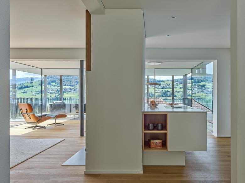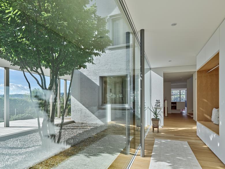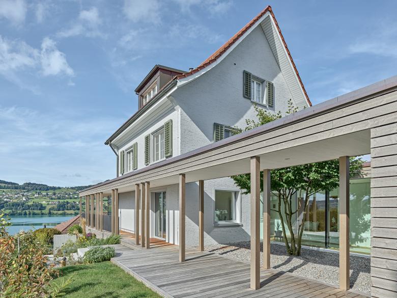 Im neu erstellten Entree gibt die vollflächige Verglasung den Blick frei auf das Atrium mit angegliedertem gedeckten Morgensitzplatz. Der Wohn- und Ess-/Küchenraum befindet sich innerhalb der alten Struktur, wurde jedoch so weit wie möglich geöffnet und mit einer grossen umlaufend gedeckten Veranda, welche den Blick zum See hin frei gibt, erweitert.