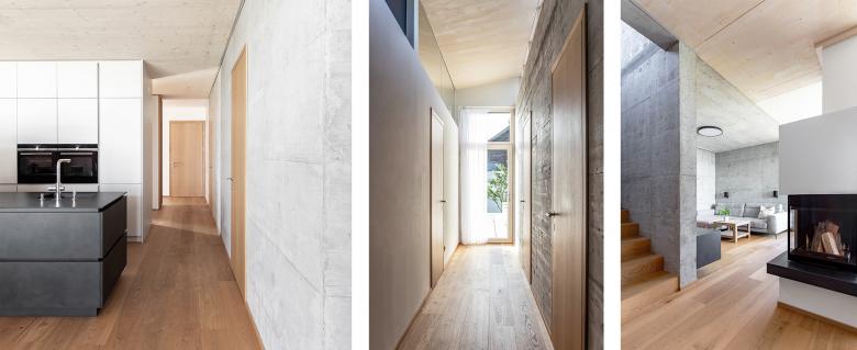 Die gesamten Innenräume bilden eine offene Wohnlandschaft, wobei viel Wert auf ein helles und sonniges Wohnambiente gelegt wurde und die Wohn- und Essbereiche so angeordnet sind, dass sie ihre ganz eigenen Ausblicke auf die Umgebung zulassen. Durch präzise gesetzte Fensteröffnungen ist genau diese Atmosphäre in der gesamten, offenen und durchgehenden Raumstruktur erlebbar.