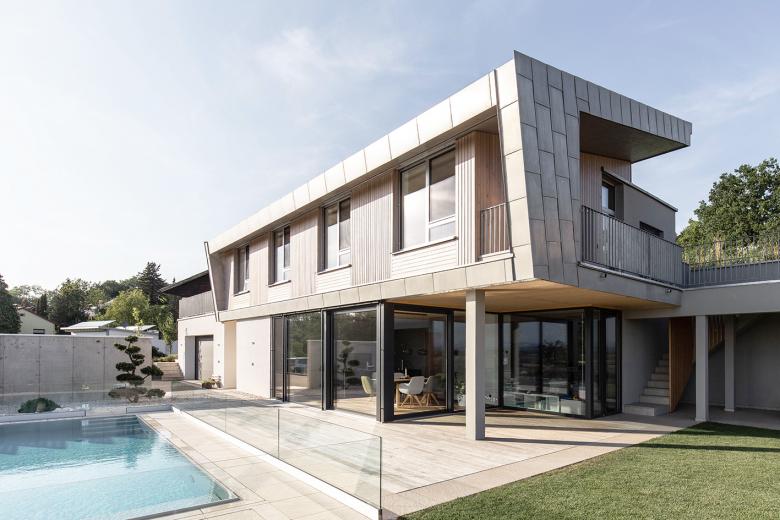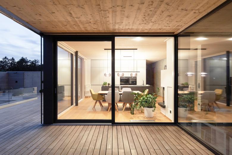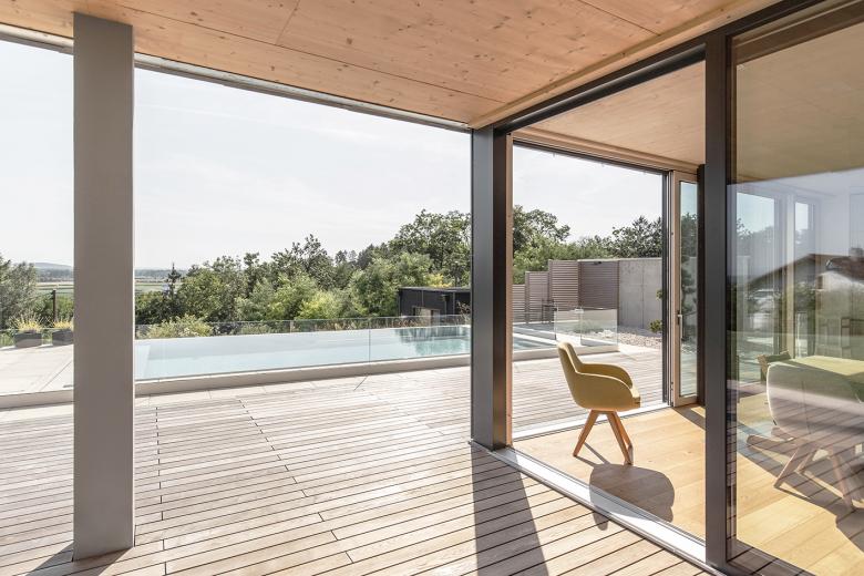 In Zusammenspiel mit den großzügigen Terrassen (auf beiden Ebenen) wird ein offenes Wohnen, mit viel Bezug zur Landschaft und dennoch ein geschützter und heimeliger Außenbereich geschaffen.