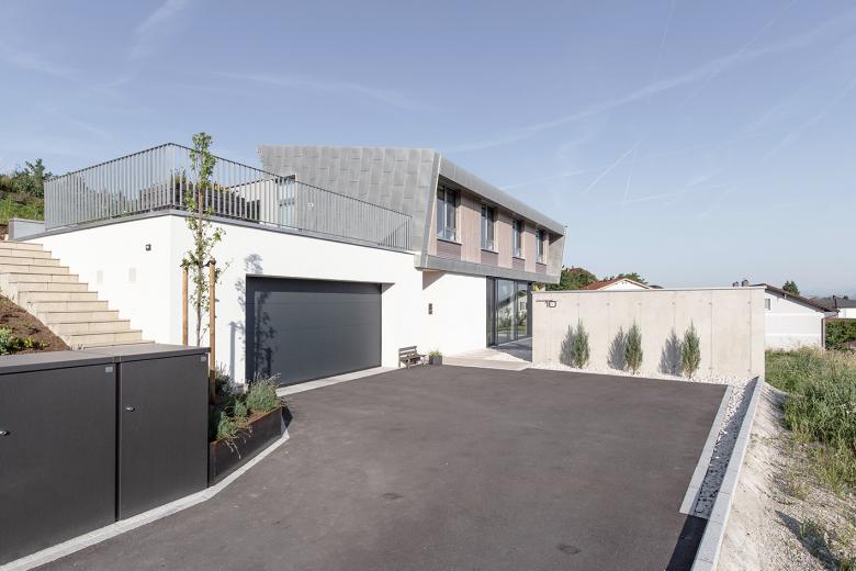 Die Längsseite des Wohnhauses (das eigentliche Rückgrat) stemmt sich quasi gegen den Hang und ermöglicht durch seine Lage und Orientierung, (Garage, Nebenräume, Wohn- und Lebensbereiche, geschützte Terrasse und Geräteraum sind in einer länglichen Großform zusammengefasst), einen ebenen und geschützten Gartenbereich.