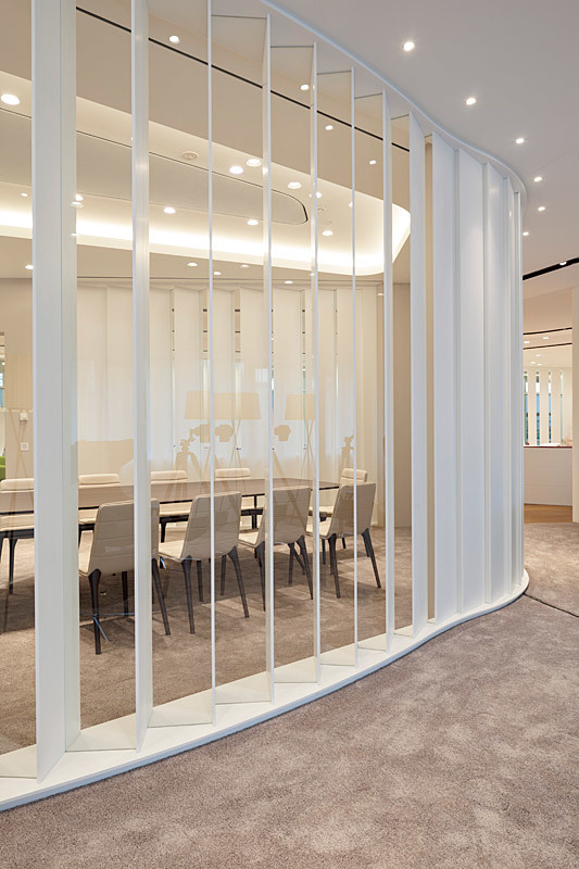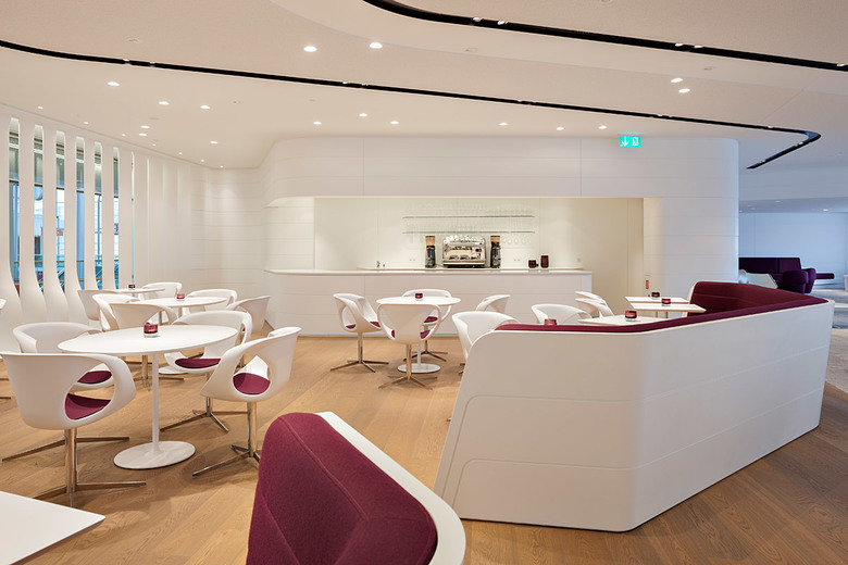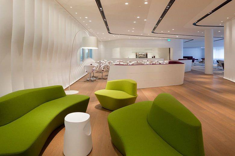 Die Innenarchitekten/Architekten Tina Aßmann und Erich Gassmann gestalteten die Lounge bewusst zurückhaltend, um sie vom umtriebigen Geschehen in den Messehallen abzusetzen. Für Lounge-Feeling sorgt auch das Lichtkonzept.