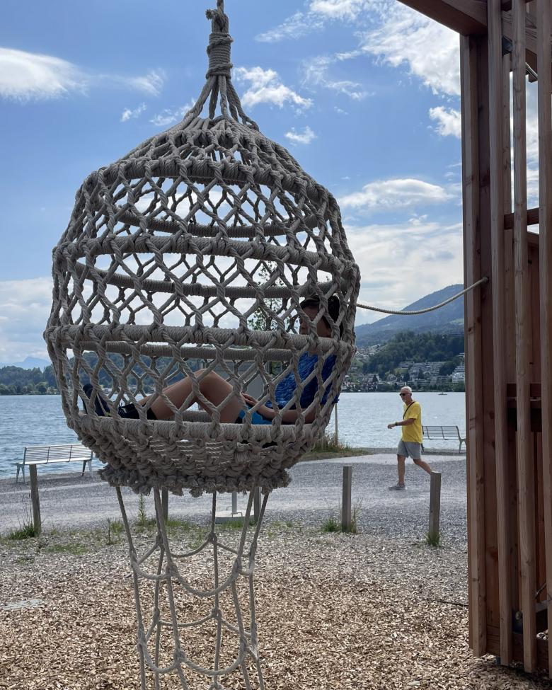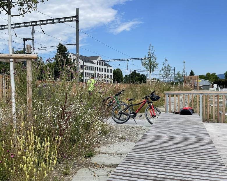 Holzdecks laden zum Verweilen ein, während ein naturnah gestalteter Spielplatz