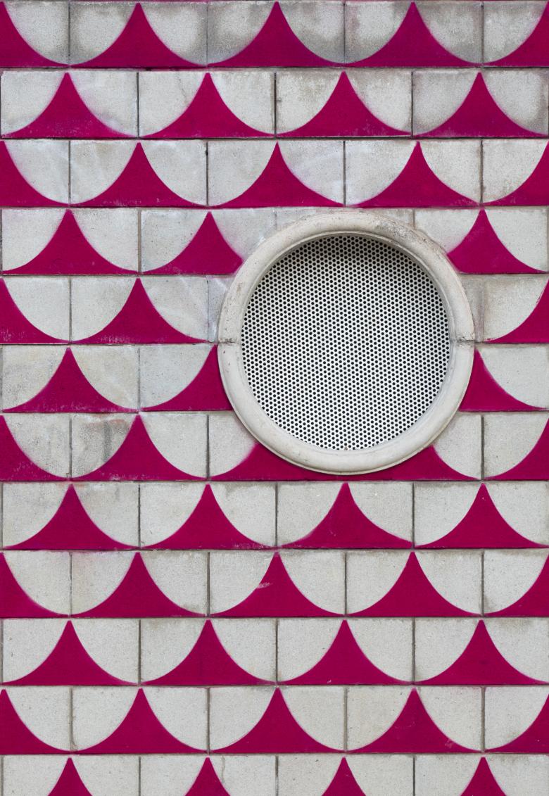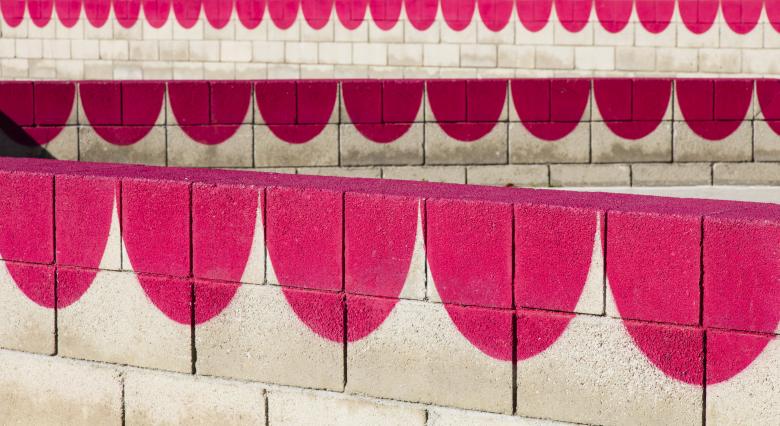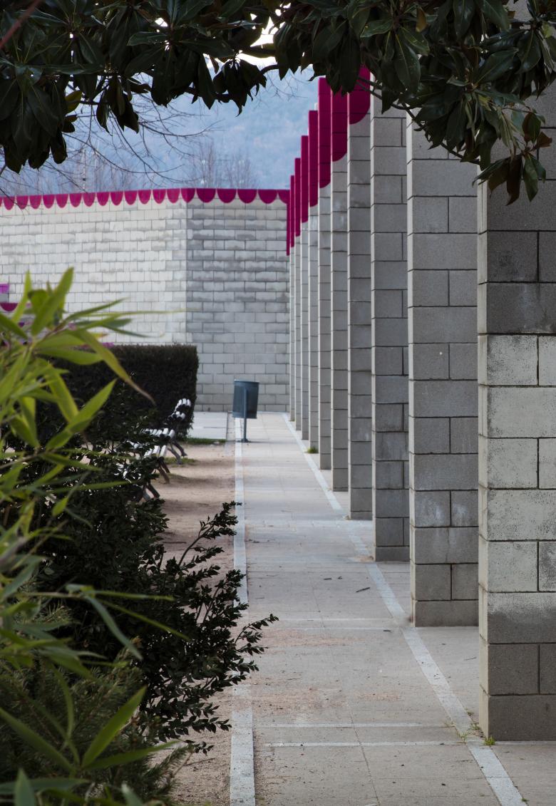Aplicando una capa selectiva de pintura, la intervención lee y pone en valor la cualidad espacial, la geometría y los sistemas constructivos de la plaza. Coronamientos, estampados y alfombras atorgan ligereza, luminosidad y color a las paredes de bloque de mortero, partiendo de la misma modulación y reforzando la naturaleza textil del soporte.