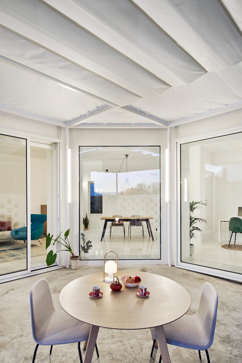 Son espacios configurados por una estructura metálica con toldos replegables, que mejoran el comportamiento climático del edificio. Ante esta arquitectura liviana, la casa es compacta, de muros de carga. Se repite un único formato de ventana perfectible, a excepción de las corredizas que maximizan la apertura de la planta baja.