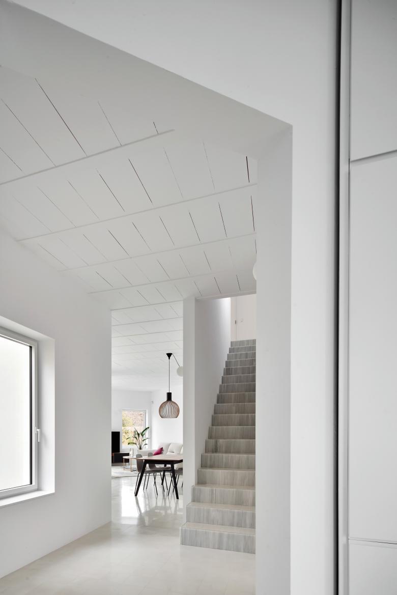La escalera, dispuesta en diagonal en el centro, organiza la casa en dos cuerpos capicuados en C. Cada parte abraza un palio con una fachada achaflanada. La mayoría de ventanas se abren aquí, permitiendo una visión en diagonal que otorga profundidad visual y resguardo de los vecinos. La geometría y disposición de las aperturas permite disfrutar de distintos tipos de luz en una misma habitación y ver la propia casa a través de las ventanas.