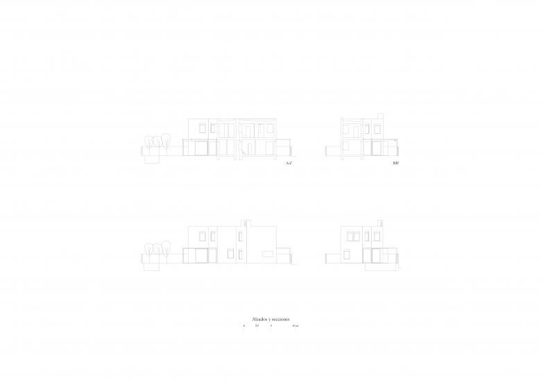 Una casa de dos plantas amoldada entre dos palios. Esta es la respuesta al conflicto habitual entre un deseo –disfrutar de los atributos espaciales una vivienda aislada- y el planeamiento –parcelas pequeñas y separación mínima a lindes de 3m-. La posibilidad de instalar elementos ligeros en el espacio no edificable es el resquicio de la ordenanza que será motor de proyecto.