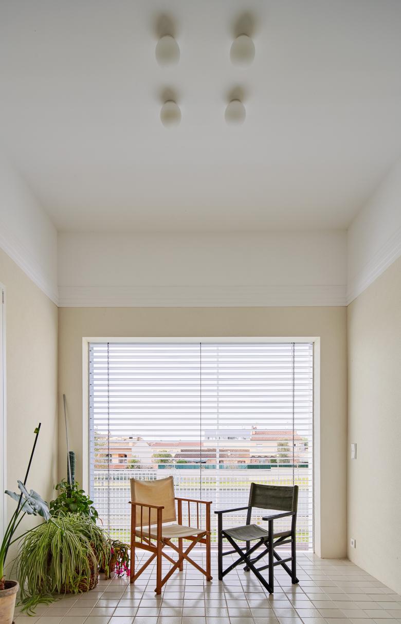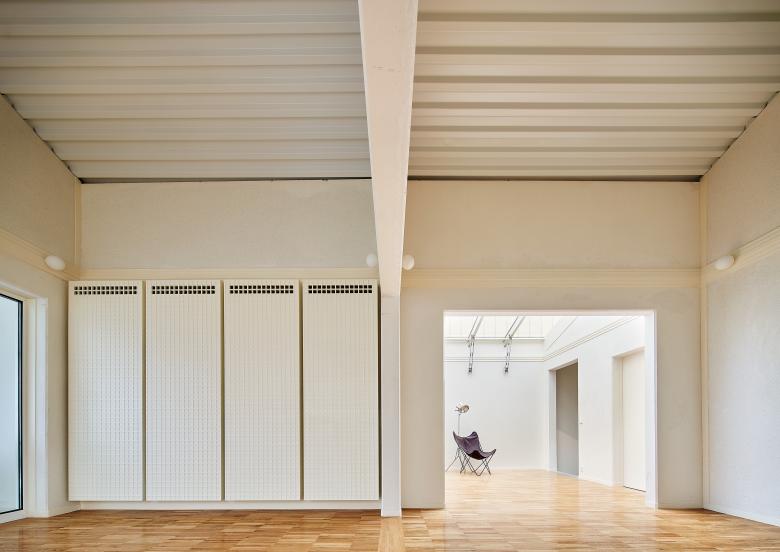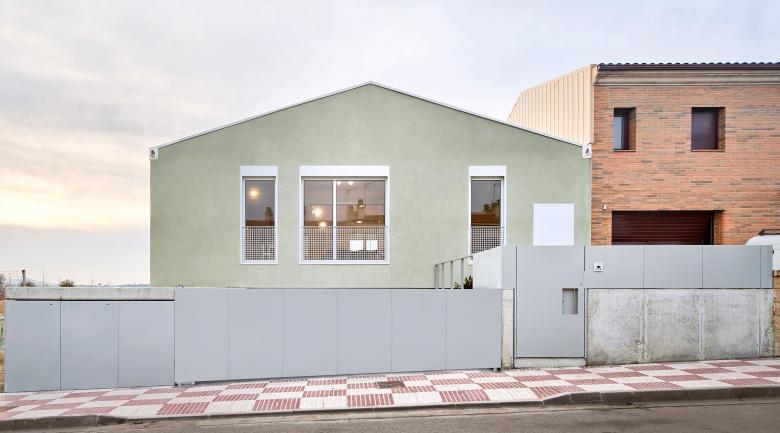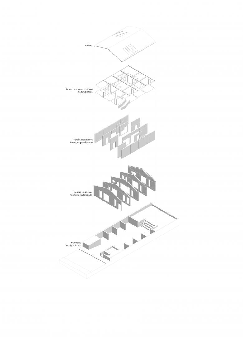 Encima se construye la casa con piezas de hormigón prefabricado, que a modo de grandes jácenas, salvan la luz del basamento. Para optimizar costes de construcción, los paneles se presentan al interior sin revestimiento, con un acabado pulido tipo terrazo. Un sistema de zócalos, esquineras y frisos de madera son la respuesta a resolver la junta correctamente, otorgando al sistema un carácter doméstico.