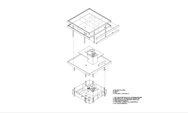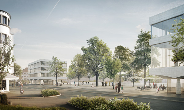 Architektonisch sind die verschiedenen Untergeschosse und die Platzfläche als weitläufiges Plateau ausgebildet, welches zugleich unterschiedlichste Anforderungen, Nutzungen und Raumprogramme miteinander in Beziehung bringen kann. Auf dem Plateau stehen die beiden neuen Gebäude. Aus dem Plateau ‚ausgeschnitten‘ sind die Abgänge in die SBB-Unterführung, der Bibliothekshof und eine Spielfläche.