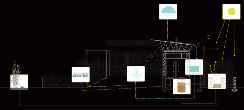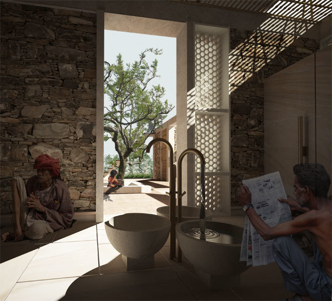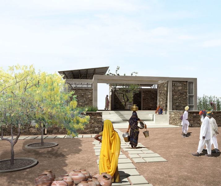 The site for the toilets was selected with the consent of the Delwara community. Its proximity to the state highway, the village bus stop, and the local clinic shall ensure active use of the facilities by the entire village. The dry composting toilets are entirely self-contained: all urine and wastewater is directed into evaporative plant beds. Solid waste, collected in bins, is desiccated to make fertilizer. Rainwater runoff from the roofs is collected in cisterns and gravity fed to washbasins in the toilets.A shaded central plaza anchors village gatherings adjacent to the community toilet. Rainwater collected from the roofs is directed into concrete cisterns containing sand and charcoal filters.
