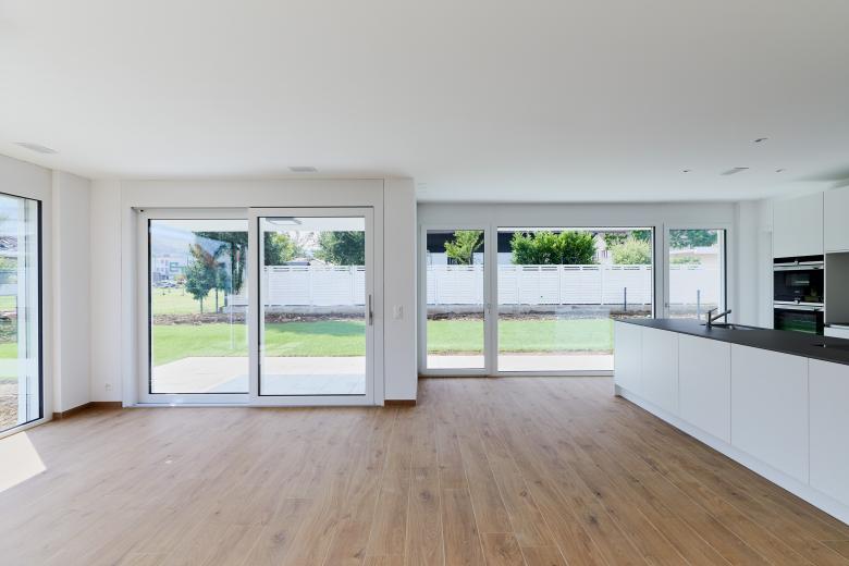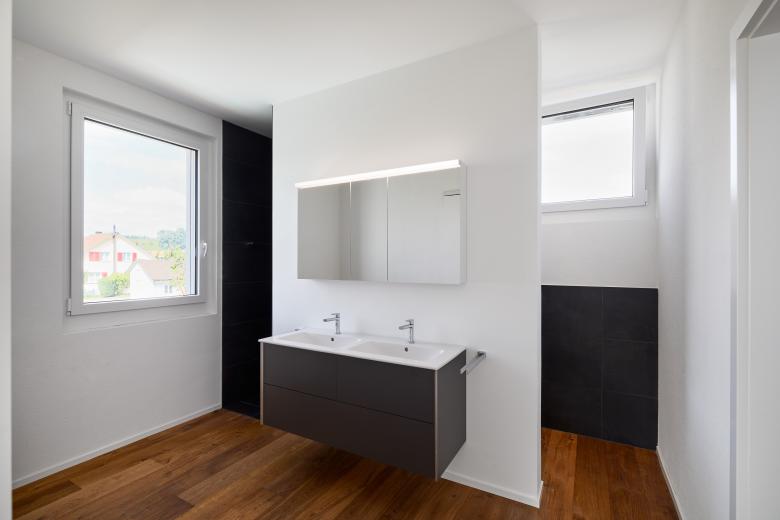 Direkt neben der Kirche entstanden in Wallbach 9 freistehende Einfamilienhäuser mit Photovoltaikanlage. Verbunden sind die EFH durch eine gemeinsame Autoeinstellhalle.