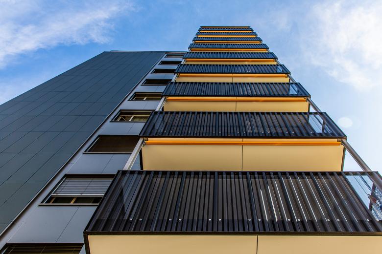 Eine PV-Anlage an der Fassade und eine Solaranlage auf dem Dach produzieren neu Energie und Wärme und verbessern so die Ökobilanz des Hochhauses.