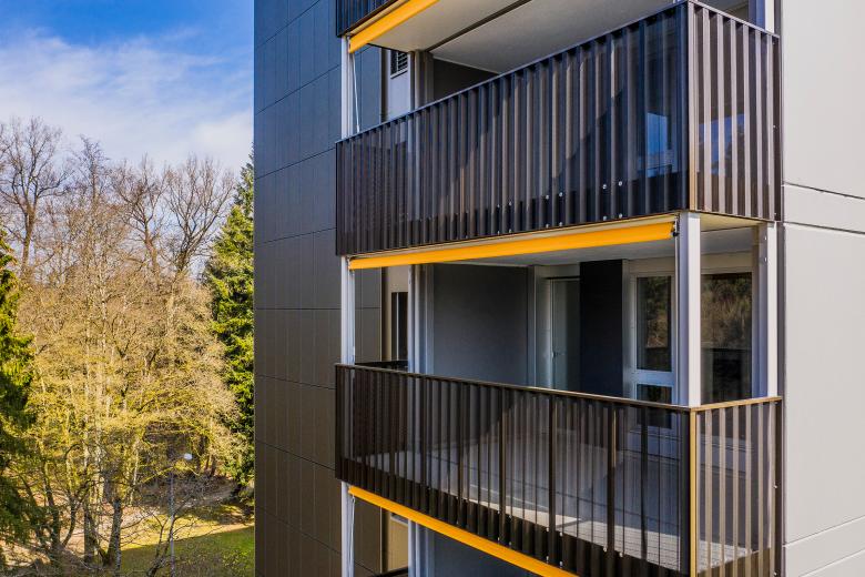 Sie erhielten eine hindernisfreie Dusche und die Liftanlage wird so ersetzt, dass sich die Haltestellen des Lifts neu auf jedem Wohngeschoss befinden. Das sechste Geschoss, welches sich bereits im Bestand an der Nordfassade als Besonderheit abgezeichnet hat und Einzimmerwohnungen beinhaltete, wurde neu eine Cluster-Wohnung mit sechs Einheiten. Die Cluster-Wohnung wird durch ein benachbartes Wohnheim gemietet und bietet Menschen mit unterschiedlichen Handicaps die Chance, selbstständig zu wohnen.