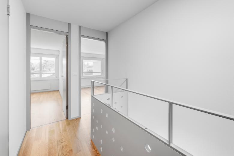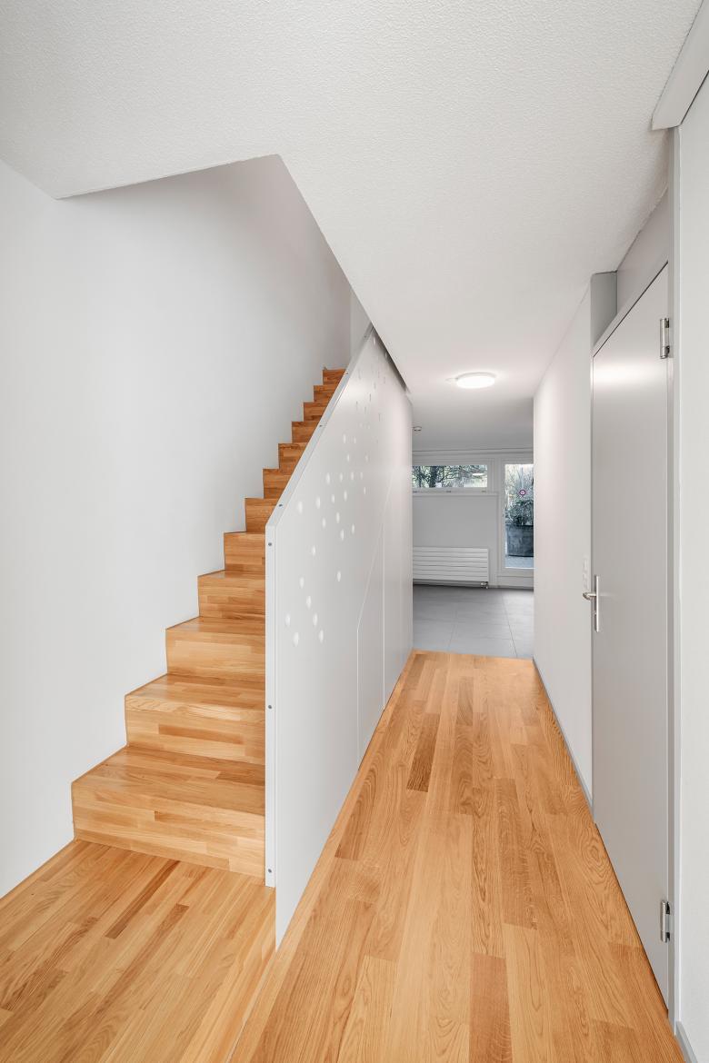 Die Grundrissanordnung der Maisonette-Wohnungen wurden leicht verändert: Das Drehen der Erschliessungstreppe ermöglichte einen neuen Eingangsbereich mit Garderobe. Das neu gestaltete Geländer erfüllt die Sicherheitsnormen, versteckt aber auch in seiner Gestaltung auf spielerische Art eine Botschaft…