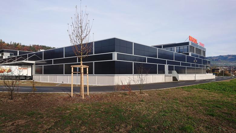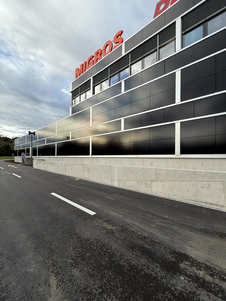 Eine der zentralen Anforderungen seitens der Gemeinde an die Gestaltung des Baukörpers war, dass dieser mehrgeschossig in Erscheinung treten soll. Die Bauherrschaft strebt - im Sinne der hohen Nachhaltigkeitsansprüche der Migros - ein Null-Energie-Gebäude an. Durch eine horizontale Gliederung der Fassade wird dem gewünschten Ausdruck der Mehrgeschossigkeit entsprochen und es gelingt die Anforderungen zu einem ruhigen, einheitlich gestalteten Baukörper zu formen. Die Gliederung erfolgt über farblos eloxierte Aluminiumbänder, welche die liegenden Solar-Panels zu einem übergeordneten Gestaltungsprinzip verflechten.