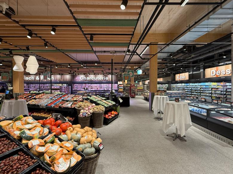 Das in den Baukörper integrierte Vordach akzentuiert auf selbstverständliche Weise die Horizontalität und somit die Geschossigkeit. Das Vordach spannt einen gedeckten Aussenbereich auf, welcher über zwei grosszügig dimensionierte Schiebetüren in die Vorzone von Migros und Denner führt. Dort verbindet sich die Wegführung schliesslich mit der vertikalen Erschliessung der drei Ebenen Parkgarage, Verkaufsfläche und Activ Fitness. Die Vorzone lädt die Besucher zum Eintreten ein, schafft Orientierung und erschliesst das gesamte Gebäude.
