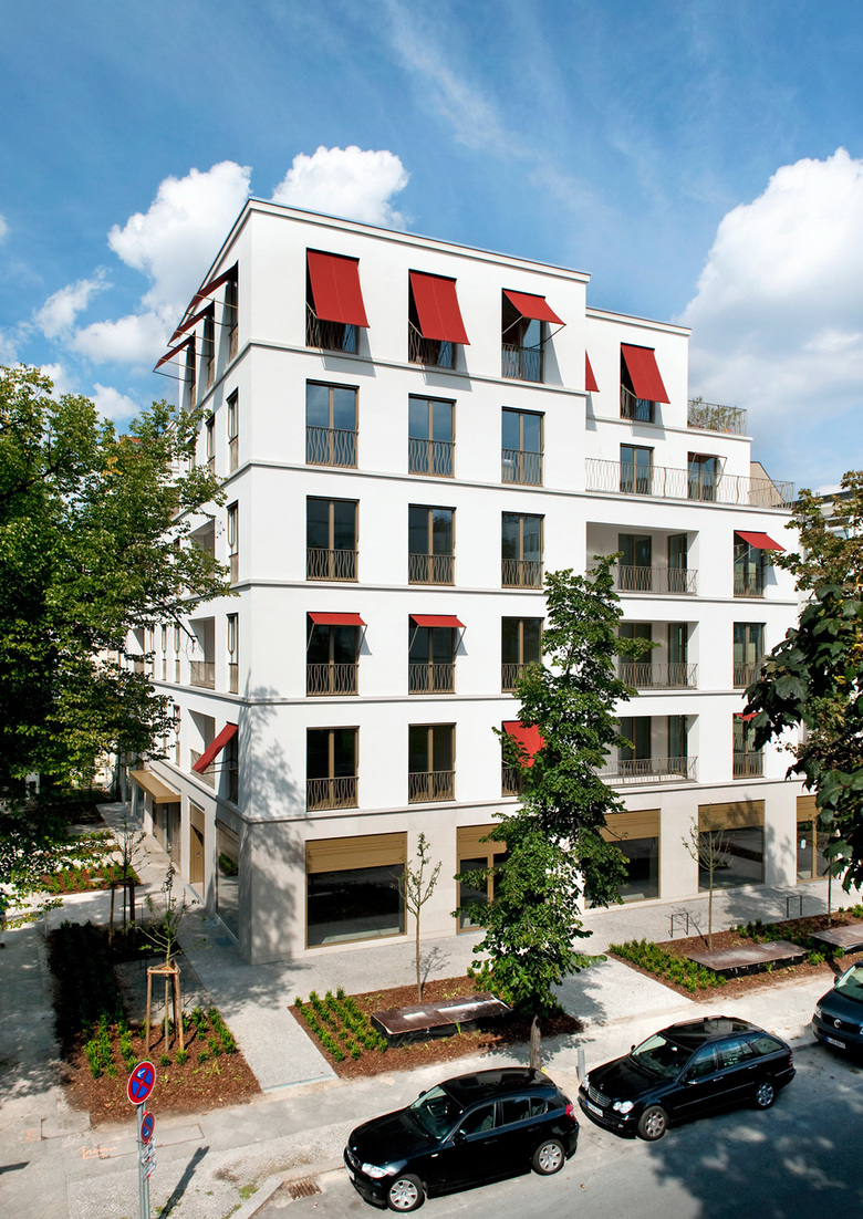Das prominente Eckgebäude definiert den Übergang von der innerstädtisch geschlossenen Bebauung zur offenen Bauweise der Dahlemer Großvillen. Die Kubatur nimmt die verschiedenen Höhen und Dachformen der benachbarten und gegenüberliegenden Bebauung auf und interpretiert sie im Sinne qualitätsvoller Terrassenwohnungen auf eine neue und moderne Art.