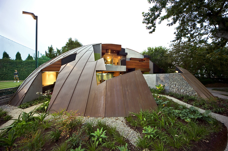 In this project, the copper clad sphere is partially buried, and then eroded internally, and at on the north and south sides to create two different gardens. The central ground floor space is detailed as a continuation of the exterior gardens, and all other spaces are either arched over or dispersed around this main space.