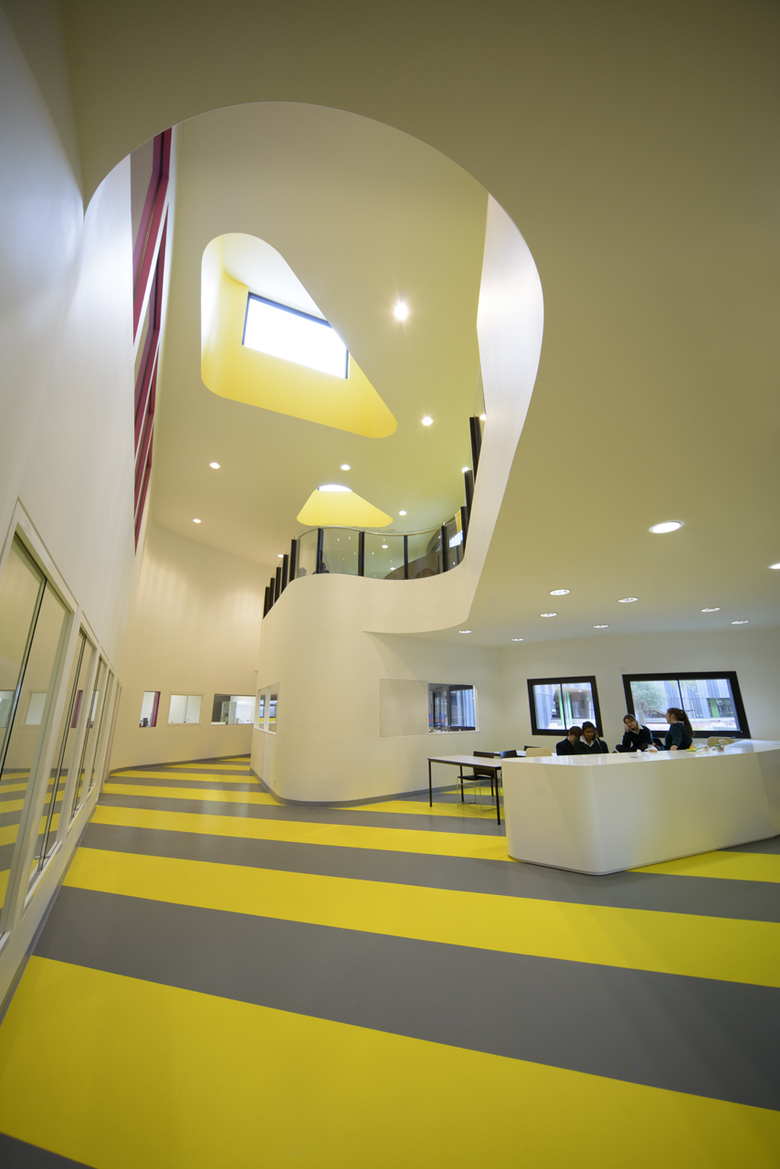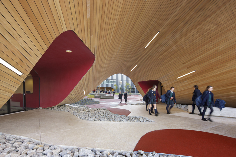 Each wing has its own qualities, different from each other and yet seamlessly connected to the next. In this way the building acts as an embodiment of the journey of education, with less distinction of any prescribed boundaries between disciplines. The colour strategy reinforces the identity of the academic disciplines, universally enhanced by the richness of natural materials such as locally recycled timber, resulting in a variety of spaces and volumes encased within a unifying skin not unlike a collection of villages within a walled citadel with its gardens and ceremonial arches.
