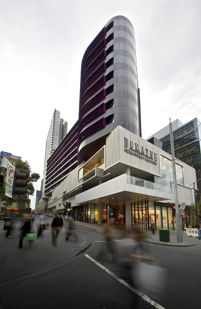 Our project was for an eight level apartment building comprising of 136 apartments above a 3-storey retail podium by another firm. The elation of our first large commission was tempered by a terrifying sense of responsibility - the design of a speculative apartment building opposite the historic State Library, its forecourt and Melbourne's ceremonial axis. At this scale our architectural anxieties were amplified. We faced a shifting program (or market), a limited material palette and the repetitive language of the typology which resisted our preference for a single gesture. The design also had to survive the rigours and inevitable cost-cutting of speculative construction. The breakthrough came when we divorced the apartments from their retail podium by a transfer slab. The new building was a simple object but one capable of responding to a multitude of urban conditions. We heightened the tensions between podium and tower, historical city datum and contemporary skyline. We inflected the form by the presence of the State Library's dome. We accepted stacking and repetition, seeking its intrinsic value and resonance. Focusing on materials which were appropriate to the site, that had longevity and which would enhance the form we alternated bands of polished black concrete and pearlised painted metal fins / black aluminium. Within the singularity of the form we had a parallel ambition to design every apartment differently. In each apartment a similar model is followed, a central service core contains the kitchen, bathroom, mechanical services and joinery. Sliding doors retract into the core to allow for continuous circulation and flexibility. Surprisingly we found that the more convoluted the apartment perimeter the better the apartment. The shape which was originally about public responsibility was now increasing the private amenity. The building's distorted envelope resulted in seventeen unique apartments, multiplied by four colour schemes. We had approached our ambition.