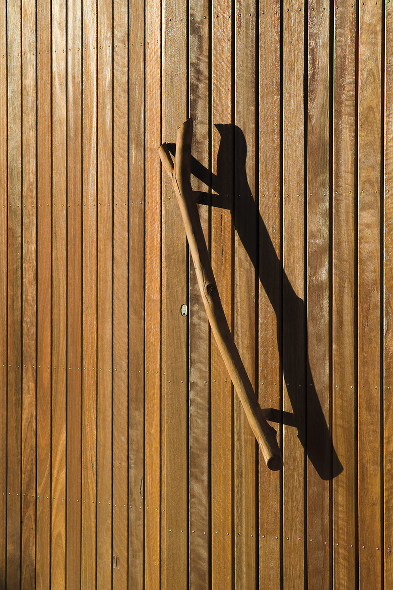 There is a clear hierarchy in this house. Contrasting to the raked timber wall that stretches from the letterbox to become the westerly verandah, the remainder of the house appears as a simple modernist expression akin to many of the houses of the region. On approach, the raked timber wall appears to have morphed from out of the diminutive letterbox. Yet from other perspectives the house appears to have been carved away. The two techniques are conceptually contradictory.