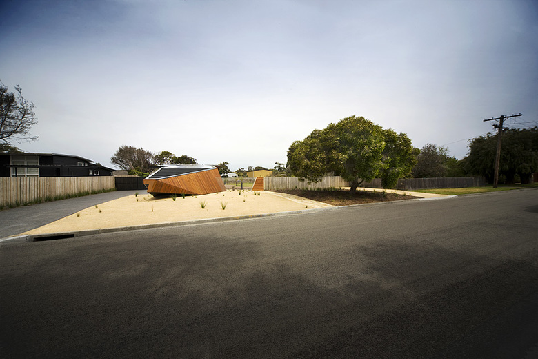 Charles Street is located in a holiday suburb on the Mornington Peninsula, a stone’s throw from the Blairgowrie beach. Amid the modest beach houses are dotted the more elaborate retirement homes of cashed up baby boomers. The houses are set in a prosaic rectangular grid. There is however enough space between the structures for space and landscape to dominate. We wanted our intervention to be equally as modest. Perhaps perversely, we had the idea it could hide behind the letterbox, or at least surreptitiously emerge from it. Space could dominate and we could still have a building of significant intrigue that rewarded the inspection of the passerby.