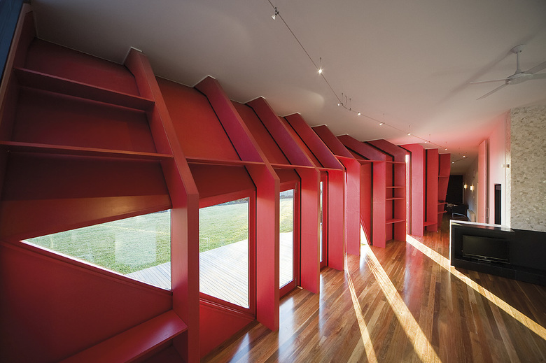 The wall is a wrapped deck, cliff, upturned boat, frozen wave, verandah and, internally, a depository of the bric-a-brac collected on beach holidays - an essential medium for evoking family memories. The wall is an in-between zone, a powerful stage for enacting family life. It is to a place to watch the kids and the sunsets, to enhance the beach holiday and to ground memory. It will be a backdrop to family photos as years pass.