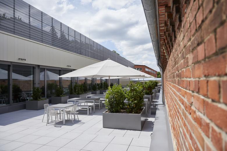 Mit viel Feingefühl haben wir die historische Substanz erneuert und durch einen Anbau ergänzt. Entstanden ist ein großer Speisesaal, der sich kathedralenartig öffnet und Platz für 800 Personen bietet. Ein funktionaler Küchentrakt mit Free-Flow-Bereich sowie Event- und Casinoräumen für kleine Gästegruppen ergänzen das Gebäudekonzept. Das Besondere am Speisesaal: Er kann zur Eventhalle für Veranstaltungen mit 1000 Mitarbeitern umgebaut werden.