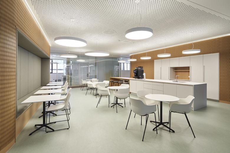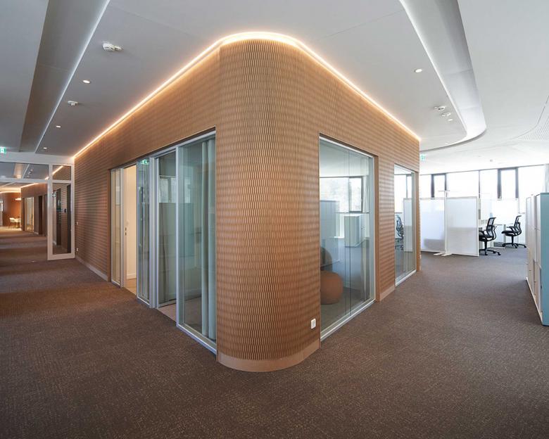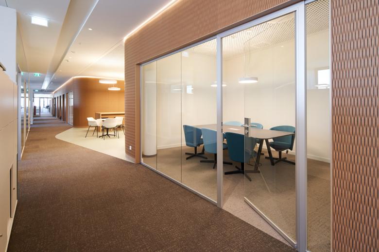 Die benachbarte Bürowelt erstreckt sich über drei Stockwerke und ist überwiegend durch Glas geprägt. So eröffnen sich den Mitarbeitern helle Räumlichkeiten mit einem freien Blick ins Grüne.