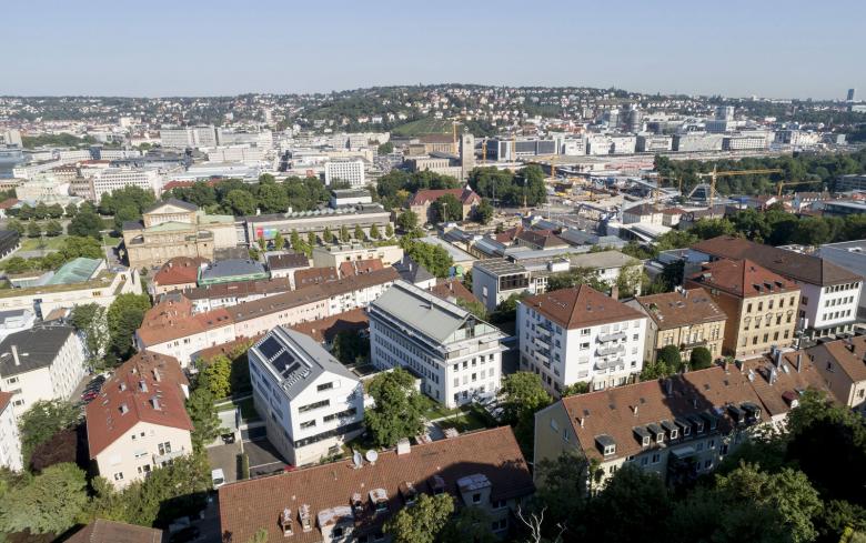 Die Bürgschaftsbank Baden-Württemberg liegt im Zentrum von Stuttgart und wird aus einem Ensemble von drei nebeneinanderliegenden Einzelgebäuden gebildet. Im Zuge der Erweiterung wurde das linke Bestandsgebäude durch einen Büroneubau mit Tiefgarage ersetzt. Dieser fügt sich mit seiner klaren und reduzierten Gestaltung stimmig in das städtebauliche Umfeld ein. Der Neubau wird ausschließlich als Bürogebäude genutzt und umfasst zusätzliche Büroflächen sowie eine Cafeteria. Im vierten Obergeschoss befindet sich ein Besprechungsraum mit vorgelagerter Terrasse und attraktivem Ausblick auf die Stadt. Ein eingeschossiger, zu beiden Seiten transparent gestalteter Gebäuderiegel dient als Eingangsbereich und verbindet Neubau und Bestand miteinander.