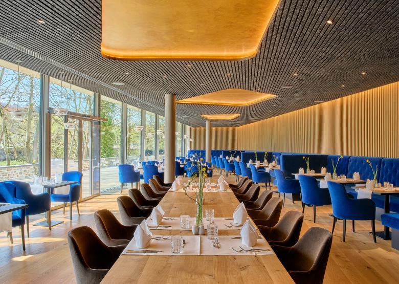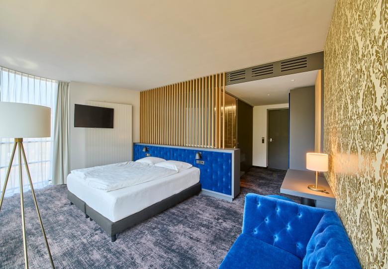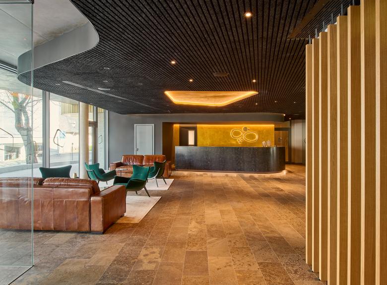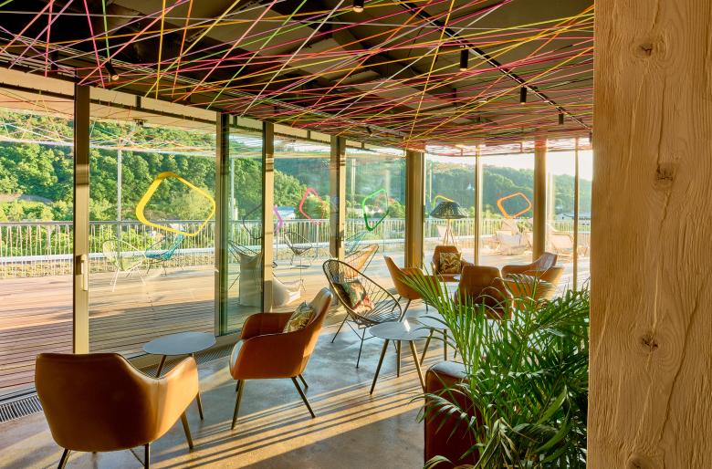 Im Erdgeschoss befinden sich Foyer, Restaurant und Bar sowie die Seminarräume, letztere sind nach Süden ausgerichtet. Die Nebenräume hingegen liegen auf der Straßenseite und bilden einen schützenden Rücken zur Viktoriaallee. Hier verleihen großflächige Verglasungen sowie Vor- und Rücksprünge in der Fassadengestaltung dem Neubau ein lockeres und transparentes Erscheinungsbild im Stadtraum. Für maximale Aufenthaltsqualität sind auch sämtliche Zimmer auf allen vier Ebenen nach Süden orientiert, mit freiem Blick auf die Lahn. Das Dachgeschoss ist der Rooftop-Bar mit großem Außenbereich vorbehalten. Damit bietet das Thermenhotel seinen Gästen ein Ambiente zum Wohlfühlen und Entspannen – noch dazu steht dem Gast über einen Bademantelgang im ersten Stock das gesamte Bäder- und Wellnessprogramm der benachbarten Emser Therme zur Verfügung.