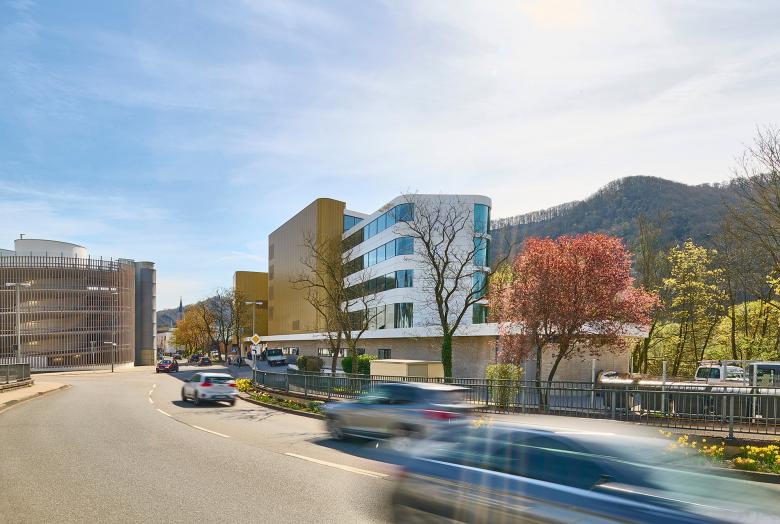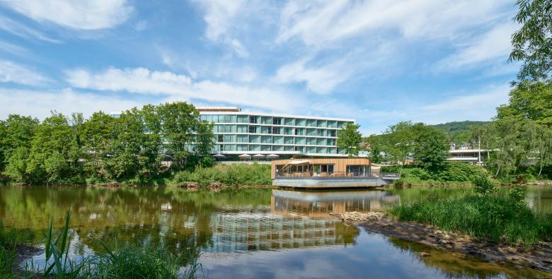 In unmittelbarer Nachbarschaft zur Emser Therme, die bereits 2012 von 4a Architekten geplant und errichtet wurde, entsteht ein neues Thermenhotel am Ufer der Lahn. Das 4-Sterne-Hotel umfasst 84 Doppelzimmer, Seminarräume, ein Restaurant und als Highlight eine Rooftop-Bar im Dachgeschoss. Um dieses umfangreiche Raumprogramm auf dem schmalen Baugrundstück entlang der Lahn zu realisieren, wurde ein viergeschossiger, langgestreckter Baukörper entwickelt, der sich behutsam in die Landschaft einbettet und in Form und Materialität Gestaltungselemente der Emser Therme aufgreift.