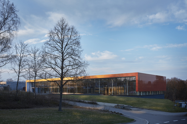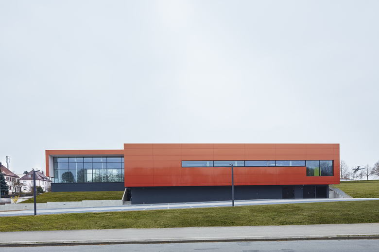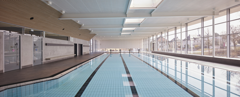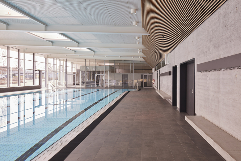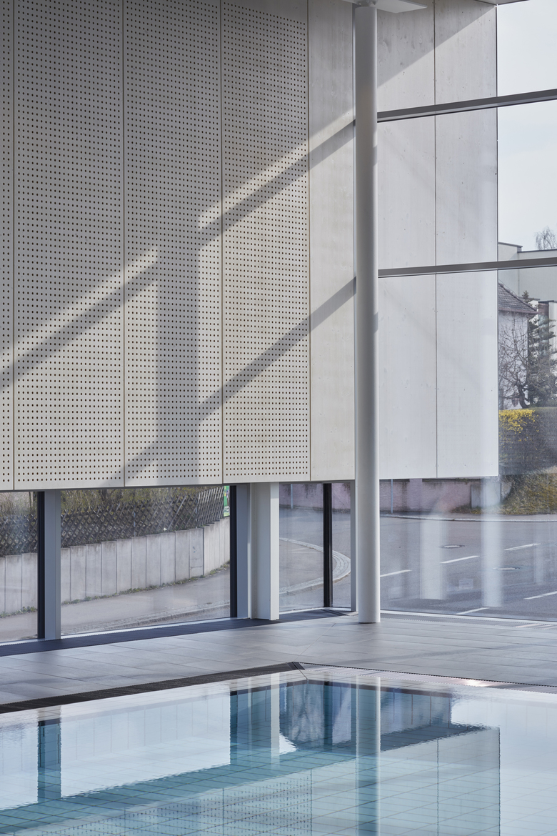Die funktionale Ausrichtung des Hallenbades Riedlingen - es wird in erster Linie von Schulen und Vereinen genutzt - spiegelt die klare und kompakte Gestaltung des Baukörpers. Behutsam in den Hang einbettet, liegt das Hallenbad am Ortsrand der Stadt Riedlingen, in direkter Nachbarschaft zum Schulcampus mit Realschule und Gymnasium. Eine Außentreppe führt den Besucher vom Parkplatz nach oben zum Haupteingang. Vom Eingangsbereich im Erdgeschoss geben großzügige, raumhohe Glasfassaden den Blick in die Schwimmhalle frei und schaffen einen Dialog zwischen Innen- und Außenraum. Das Erdgeschoss ist klar organisiert und umfasst vier Zonen: Foyer, Umkleiden, Sanitärspange und Schwimmhalle. Ihren lichtdurchfluteten und weitläufigen Charakter erhält die Badehalle durch ihre nahezu dreiseitig raumhohe Verglasung. Von außen bildet das Erdgeschoss mit seiner einheitlich gestalteten Fassade einen markanten Baukörper. Durch den Materialwechsel zum Untergeschoss und den auskragenden Barfußgangs erhält das Erdgeschoss einen schwebenden Charakter.