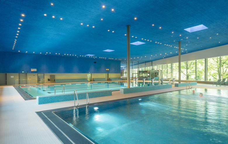 In der Sportbadehalle befindet sich ein 25-Meter-Becken mit sechs Bahnen, einer Ein- bzw. Drei-Meter-Sprunganlage und einer teils variablen Wassertiefe durch einen Hubboden. Ein separates Lehrschwimmbecken rundet das Angebot ab. Die Gestaltung der Halle ist auf das Wesentliche reduziert: klare Formen, ein zurückhaltendes Materialkonzept und schlichte Blautöne schaffen eine ruhige, konzentrierte Atmosphäre. Große Fensterflächen öffnen den Blick in die umgebende Natur. Sitzbänke laden zum Verweilen ein.