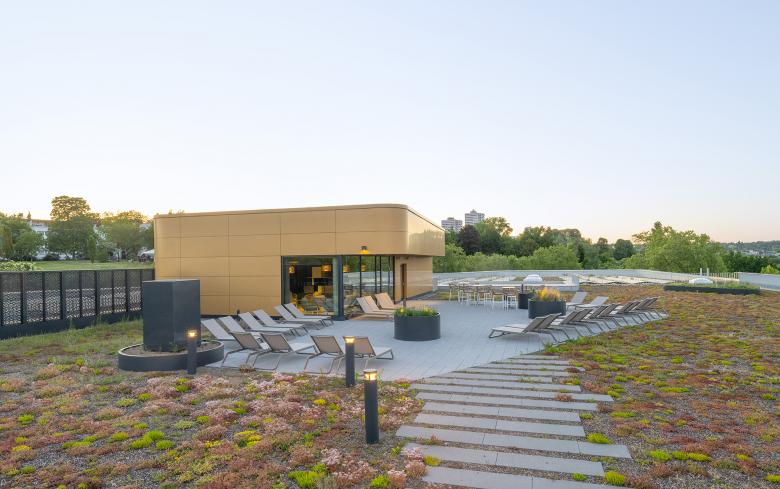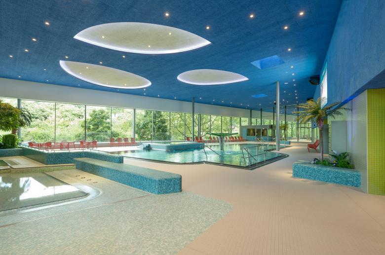 Das Obergeschoss umfasst eine großzügige Saunalandschaft mit fünf verschiedenen Saunen. Ein begrüntes Atrium sorgt für natürliche Atmosphäre, Tageslicht und hohe Aufenthaltsqualität. Ruhe- und Kaminzonen, ein Gastronomiebereich sowie ein Außenbereich mit Tauchbecken, Kaltduschen und Sonnenterrasse bereichern das Angebot. Im Dachgeschoss befindet sich zudem ein weiterer Ruheraum mit Ausblick auf die Umgebung.