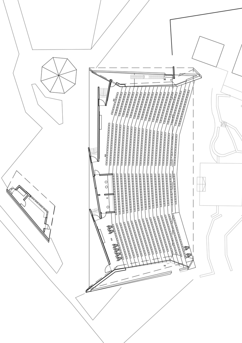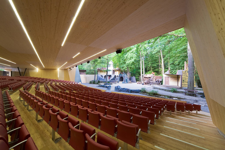 Die Zuschauerhalle mitten im Wald wurde ganz im Sinne der Bauherren „leicht, offen und modern“ gestaltet. In ihrer Bewegung symbolisiert die dynamische Bauform Wachstum und Veränderung – das Theater fügt sich als Teil der Waldlandschaft in die natürliche Umgebung ein. Die großzügige, selbsttragende Dachkonstruktion bietet rund 1.000 Sitzplätze für Theaterbesucher. Die grüne Färbung der Metallverkleidung verleiht der Konstruktion eine natürliche Anmutung. Schräg laufende Fugen in der metallenen Verkleidung folgen einer natürlichen (Un)Ordnung und greifen neben der Farbigkeit auch die Struktur des Waldes in der Fassade auf.