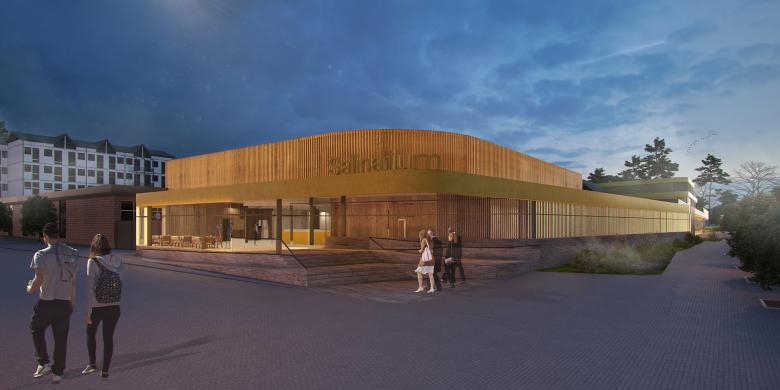 Erweiterung des Freizeitbades Salinarium um einen Thermenbereich: Die neue Therme wird unmittelbar an das bestehende Freizeitbad Salinarium angrenzen. Im Vordergrund der Planung stand, den neuen Thermenbereich optimal in die bestehenden Strukturen von Freizeitbad und Freibad einzubinden und dem gesamten Gebäudekomplex ein attraktives Erscheinungsbild zu verleihen. Den Auftakt bildet ein neu gestalteter Eingangsbereich mit weit auskragendem Dach, der die Besucher mit offener Geste empfängt und in die großzügige Eingangshalle führt. Eine hölzerne Außenwandverkleidung stimmt auf die warme Atmosphäre im neuen Thermalbad ein. Der Innenraum ist von geschwungenen Formen geprägt – sie lassen den Raum fließend erscheinen und sorgen für eine gute Orientierung. Von der Eingangshalle gelangt der Besucher sowohl zu den bestehenden Umkleiden des Freizeitbades als auch zu den neuen, farbig gestalteten Umkleiden für die dahinter liegende Thermalhalle. Diese schaffen eine heitere Atmosphäre und sind so angeordnet, dass Barfuß- und Stiefelgang voneinander getrennt sind. Nach den Umkleiden erreicht der Badegast über einen verglasten, der Westfassade vorgelagerten Gang, die neue Thermalhalle. Dort geben geschwungene Sichtbetonwände mit farbig gestalteten Sitznischen Orientierung und leiten die Besucher in die Thermenlandschaft bzw. in den neuen, zweigeschossigen Saunabereich.