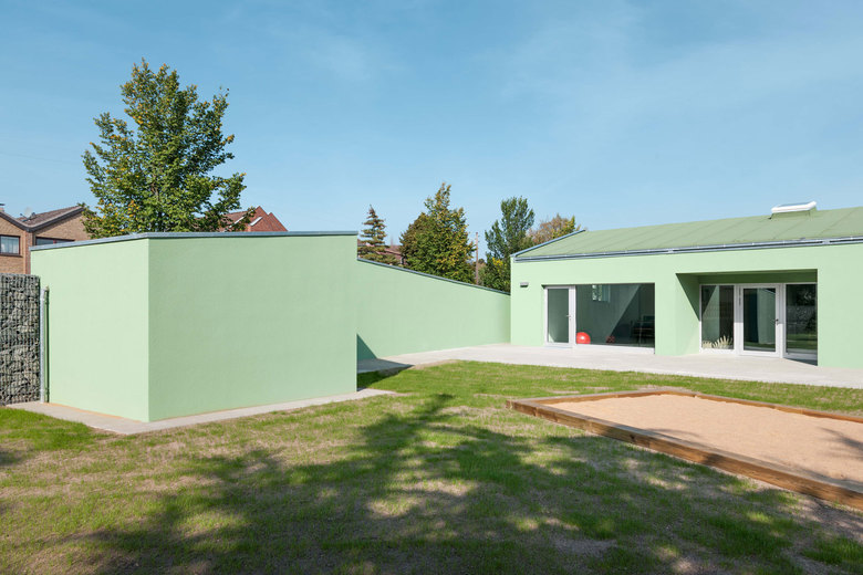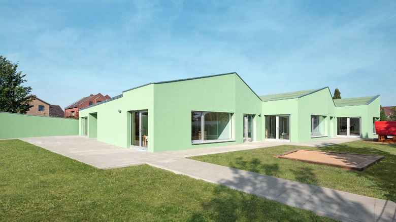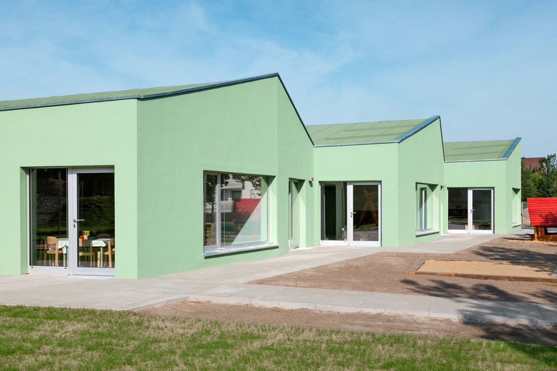 Der Baukörper entsteht durch das Verschmelzen von drei einzelnen einfach konstruierten Satteldachhäusern, deren Giebel sich staffeln und für jede Gruppe eine eigene Terrasse am Gartenausgang bilden. Entlang der Querumer Straße wird das Gebäude zur Einfriedung, schließlich zur Gartenmauer, die dann das Spielgerätehaus bildet. Die bewegte Dachfläche fügt das Gebäude in die Umgebung ein mit einem städtebaulichen Motiv, das die Parzellierung und den Maßstab der gegenüberliegenden Bebauung aufnimmt. Es wird als eindrucksvolle Raumfolge im Inneren erlebbar und durch die Dachflächenfenster nimmt der Innenraum das Spiel von Lichtrichtung und Schatten im Tagesverlauf auf als Raumerlebnis und zeitliche Orientierung.