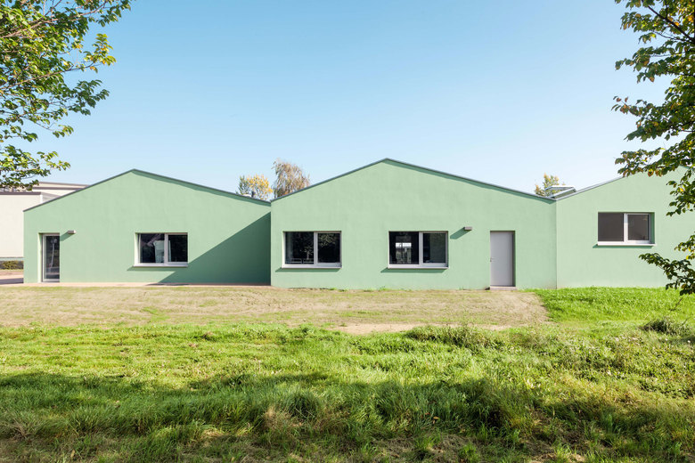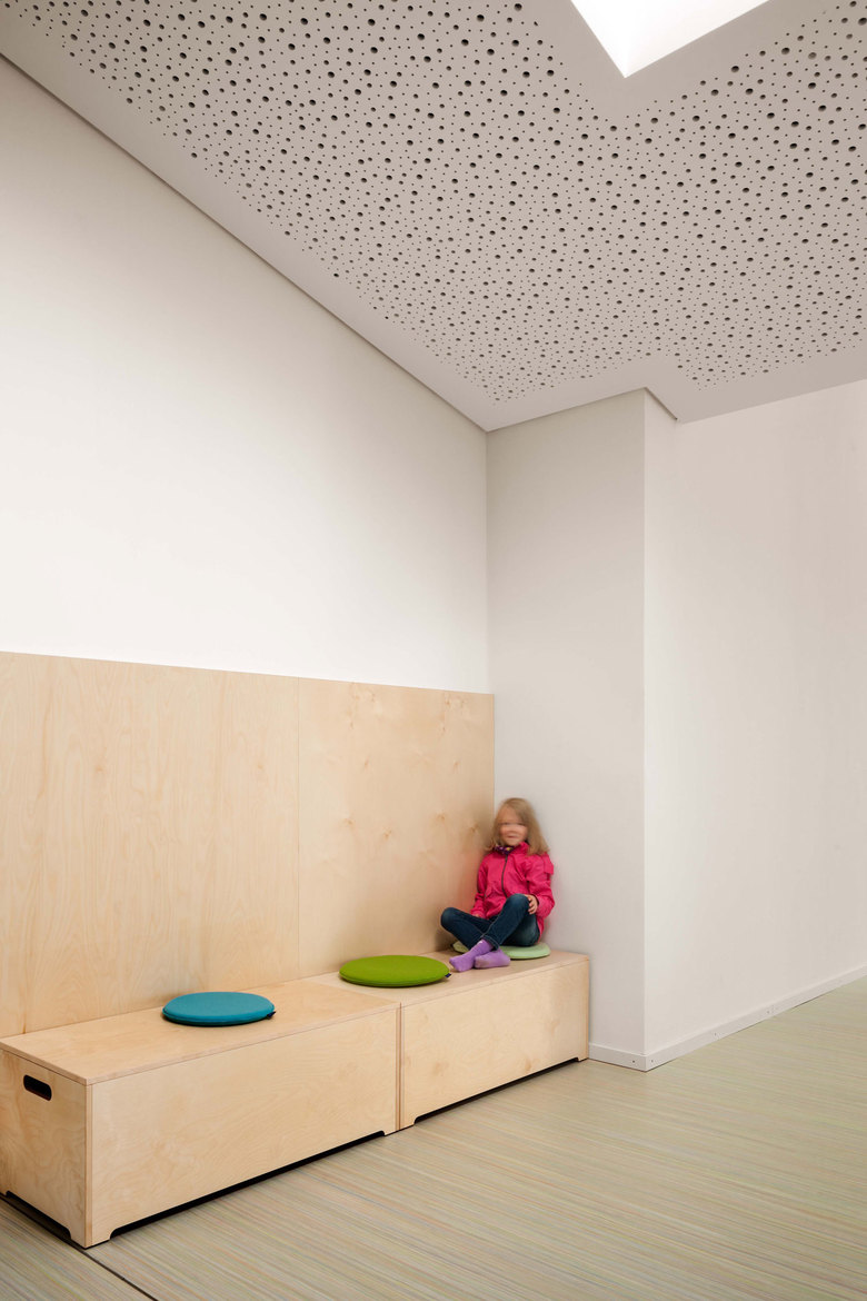 Der helle, geräumige Flur mit Aufweitungen als Eingangsbereich zu den einzelnen Gruppenräumen durchzieht das Gebäude in seiner gesamten Länge vom Haupteingang bis zum Gartenausgang. Auf der Straßenseite gliedern sich die dienenden Räume wie Büro, Hauswirtschaftsraum, Technik, Küche etc an. Nach Osten-Südosten orientiert befinden sich die einzelnen Gruppenbereiche jeweils mit dem großen Gruppenraum, Wasch- und Wickelraum, Materiallager, Schlaf- oder Kleingruppenraum. Alle Aufenthaltsräume für Kinder werden über große Fensterflächen natürlich belichtet. Durch Fenstertüren entsteht ein Übergang ins Freie und auch die kleinsten Kinder haben eine freie Sicht nach Draußen.