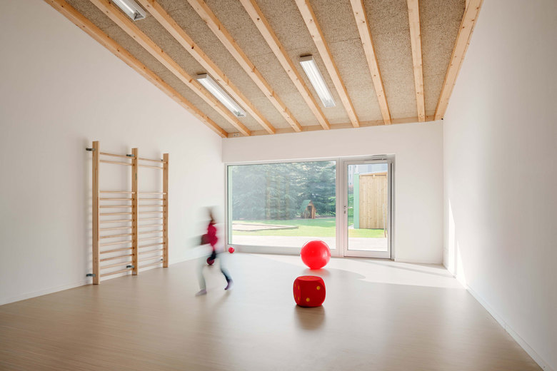 Die geneigte Deckenuntersicht unterstützt die natürliche Lüftung, und mit CO2 Sensor gesteuert, wird der Luftaustausch selbsttätig aktiviert.