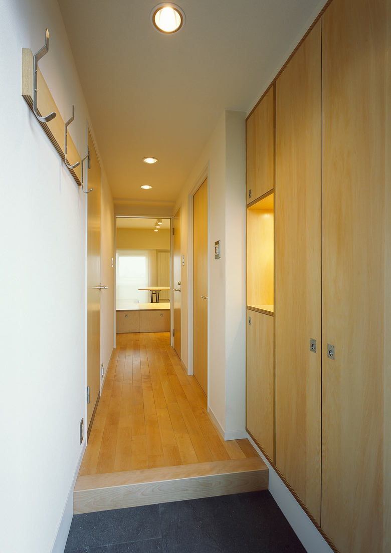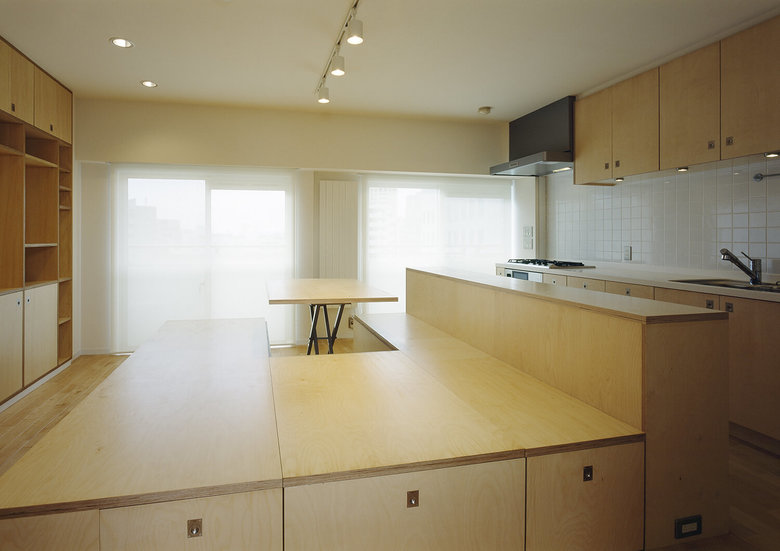 既存LDKにキッチン、ダイニングテーブル、ソファーを普通に置くと狭くなってしまうため、ダイニングテーブル、ソファーなどの用途を統合したステージフロアーをLDKの中心に置く事で、広がりのあるスペースにしました。