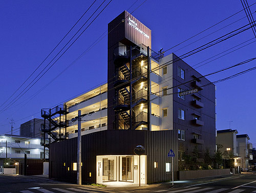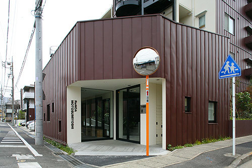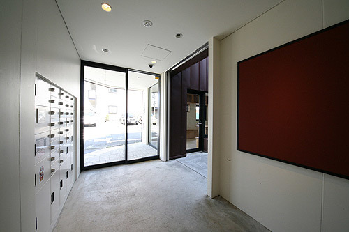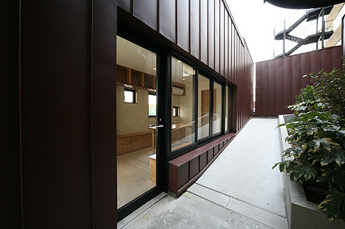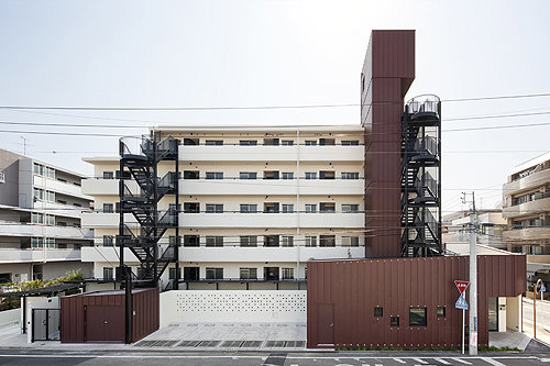外壁はエントランス部分、階段室と西面を落ち着いた臙脂色のカラー鋼板で覆い、年月を重ねるともに味わいがでるファサードとした。