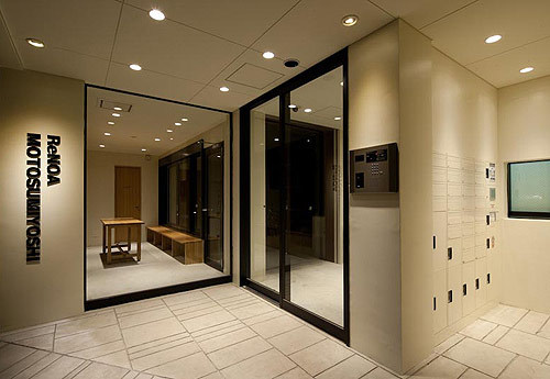 既存エントランスが貧弱だったため、マンションの顔としてのエントランスと住人のコミュニティーを形成できるスペースを提案した。またエントランスのレベルとELVの着床する1F共用廊下との間のレベル差を解消するために、スロープ状の庭園を設け、コミュニティルームから緑が眺められるようにした。