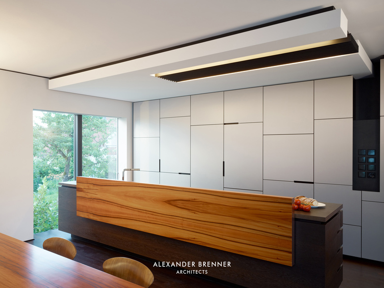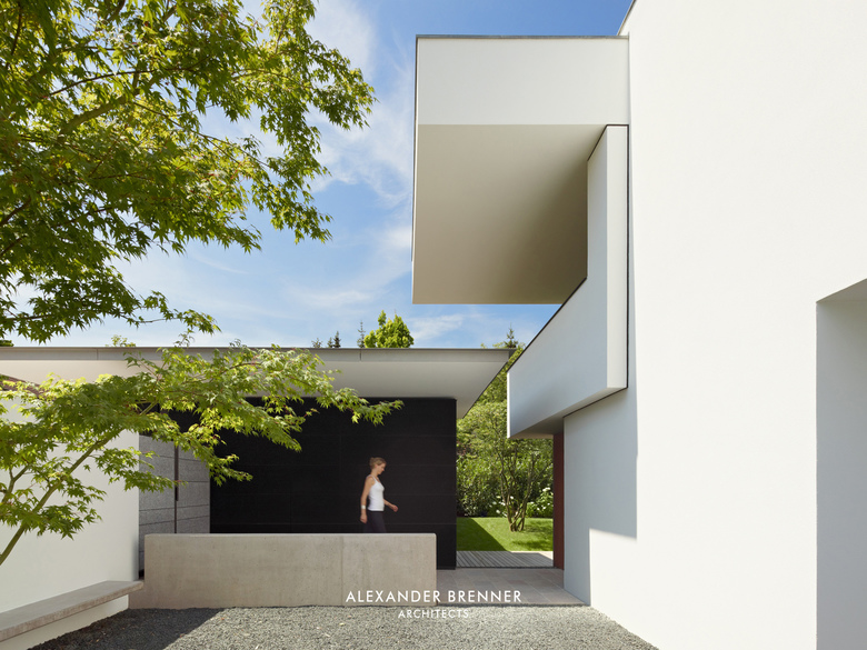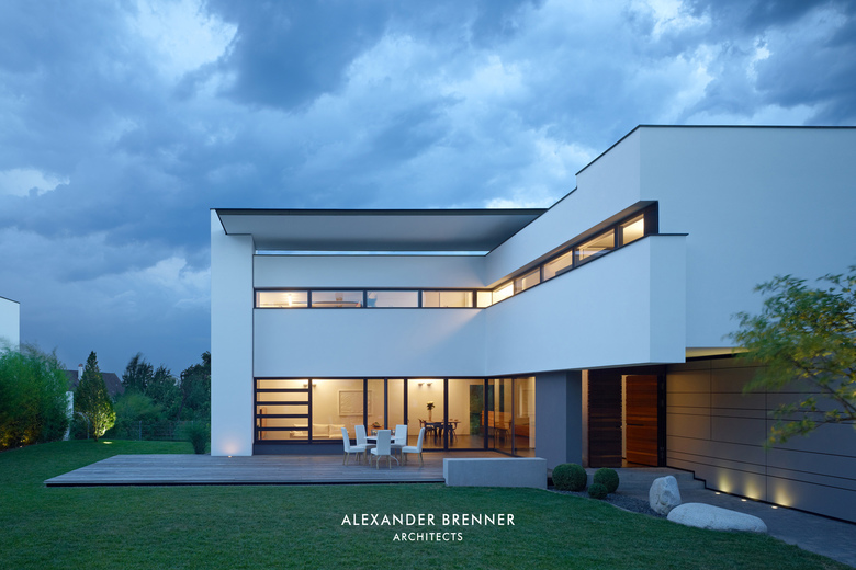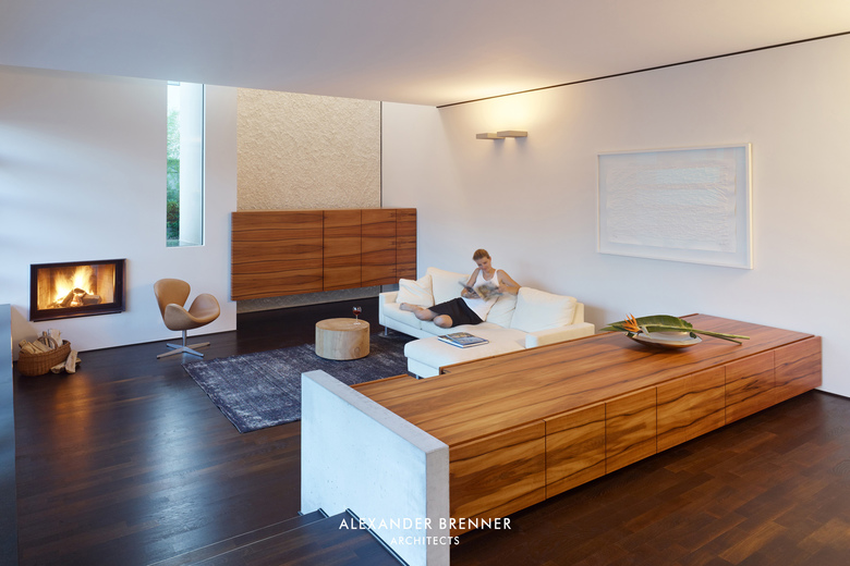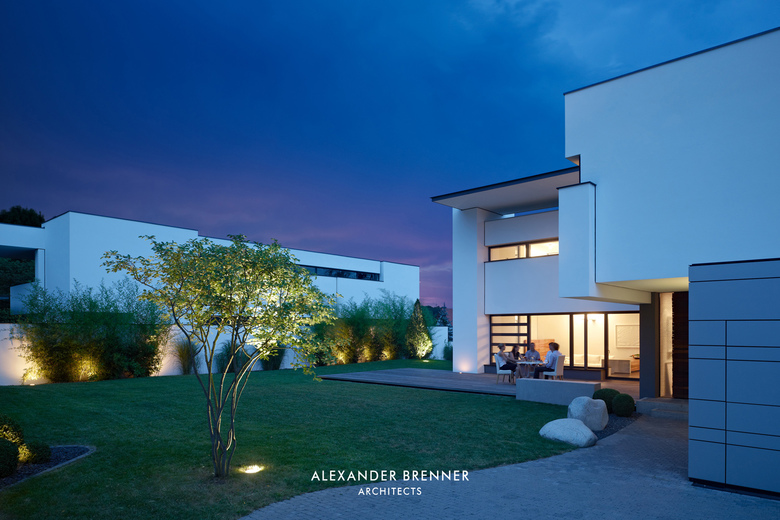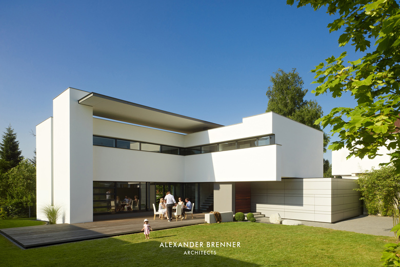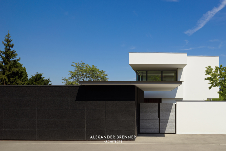Auf einem Grundstück von ca. 1.800 Quadratmetern sollten für zwei Schwestern und deren Familien zwei Einfamilienhäuser erstellt werden. Da sich das Grundstück an einer befahrenen Straße befindet und die umgebende Bebauung sehr heterogen ist, wurde das Projekt als eine Art „klösterlicher Anlage“ mit einer umlaufenden Mauer versehen. Lediglich nach Norden hin öffnet sich das Ensemble zu freien landwirtschaftlich genutzten Flächen. Neben der Abgeschlossenheit gegenüber dem öffentlichen Raum wird durch die Ausrichtung der einzelnen Gebäude zueinander eine größtmögliche Privatheit erreicht. Diesem Zweck dient auch die in der Mitte des Grundstücks verlaufende lange Wandscheibe. Als Treffpunkt für die beiden Familien wurde an der Straßenseite zwischen beiden Grundstücken ein kleiner hofartiger Platz geschaffen. Beide Häuser haben einen offenen Grundriss im Erdgeschoss, bei dem ein abgesenkter Wohnbereich die jeweilige Raumsituation stärkt und betont. Einläufige Treppen erschließen die Obergeschosse, in denen straßenabgewandt die Schlafräume angeordnet sind.