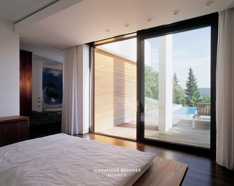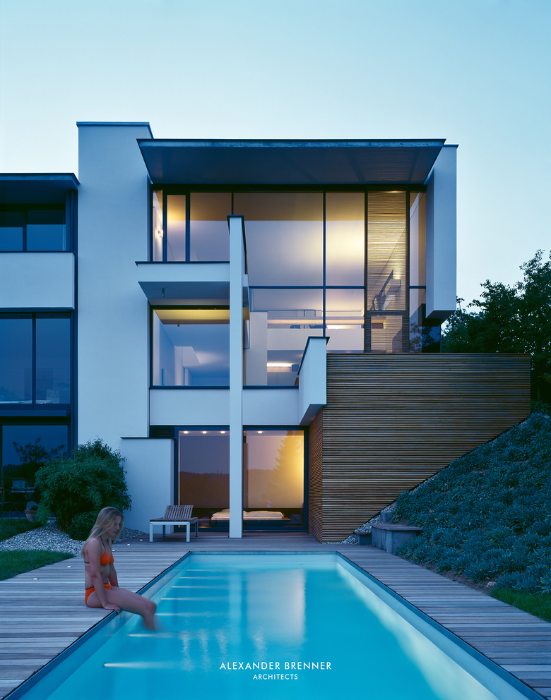 Die östliche Haushälfte verfügt zudem über einen direkten Zugang über die Garage. An einem verglasten Weinkeller vorbei gelangt man hier durch einen 14 Meter langen Ankleideraum mit Schrankeinbauten zur Badelandschaft und dem Schlafzimmer. Vor dem Schlafzimmer liegt der Pool, durch Solarkollektoren auf dem Dach ganzjährig erwärmt. Eine einläufige, von oben belichtete Treppe erschließt alle drei Ebenen des Hauses.