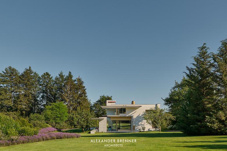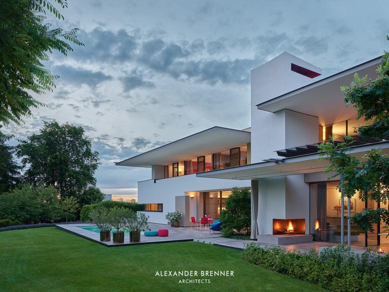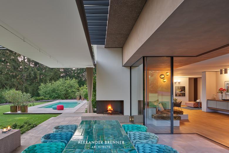 The living level is designed as an open-plan spatial continuum with predominantly floor-to-ceiling glazing facing south west over the landscape garden. The open hall leads to the dining and the kitchen area, which is adjoined by a terrace and a pool facing south-west and to the living area with its fireplace.