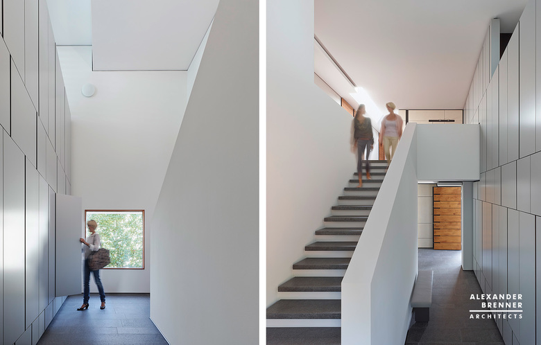 Zur Straßenseite hin sind vor allem im Obergeschoss Nebenräume und Bereiche angeordnet, die keine Fenster benötigen. Durch die Vor- und Rücksprünge, die auskragende Dachscheibe und die verschiedenen Oberflächen, die sich bis in die Außenanlagen fortsetzen, entsteht für den Stadtnutzer ein differenziertes, tiefes und kraftvolles Bild.