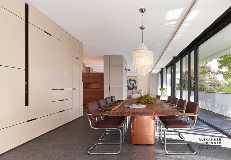 Der bis unter das Haus reichende, lang gestreckte Baukörper mit Garagen und Nebenräumen schirmt den Garten zum öffentlichen Raum hin ab. Das Haus öffnet sich mit allen Wohnräumen hangabwärts zum südlich gelegenen Wald.