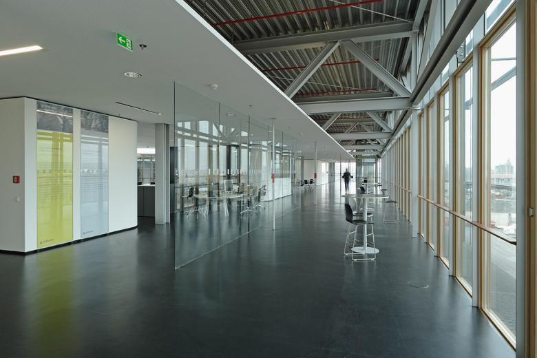 Den Kern der Werksanlage bildet eine hängende Ebene inmitten der technisierten Produktion, direkt über der Kappanlage, die auf diese Weise stützenfrei bleiben kann. Um die hängende Ebene läuft eine raumhohe, gläserne Doppelfassade. Sie schafft Transparenz und ermöglicht hier ein ruhiges Arbeiten bei gleichzeitigem Sichtkontakt zur lärmintensiven Produktion. So lässt sich über allseitige Ausblicke der Produktionsprozess für Mitarbeiter und Besucher verfolgen und erläutern.