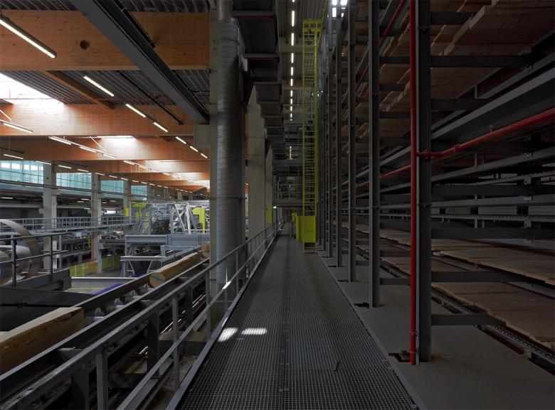 Das ‚Mannschaftsdeck‘ dient auch als Brücke zwischen West- und Ostseite des Gebäudes über die Rundholzaufgabe hinweg. Durch diese 18 m breite Öffnung gelangen die Holzstämme quer in das Werk hinein. Direkt unter dem ‚Mannschaftsdeck‘ verlaufen Kranbahnen. An ihnen können die Stämme im Falle einer Störung bewegt werden.